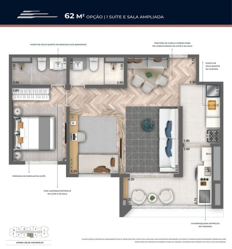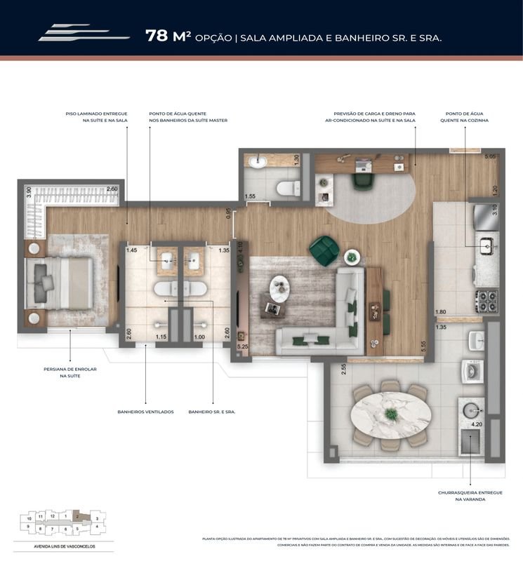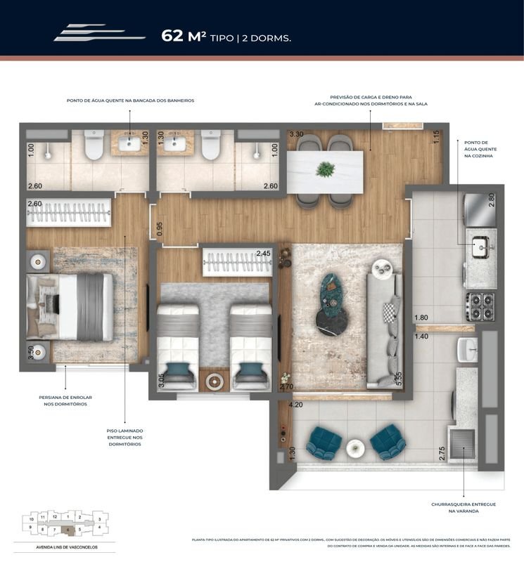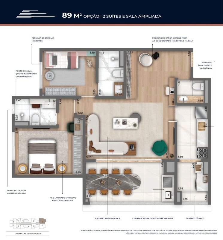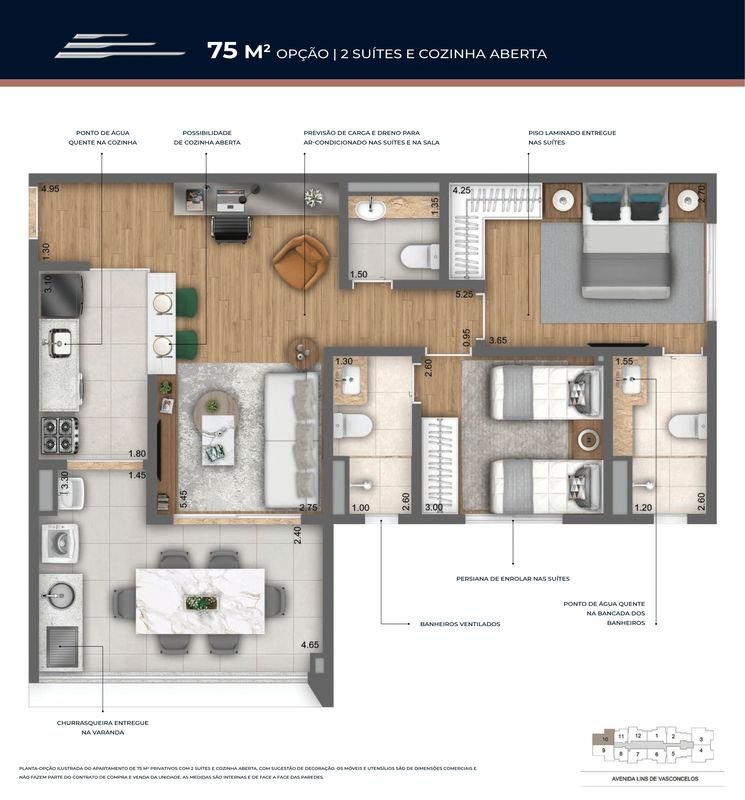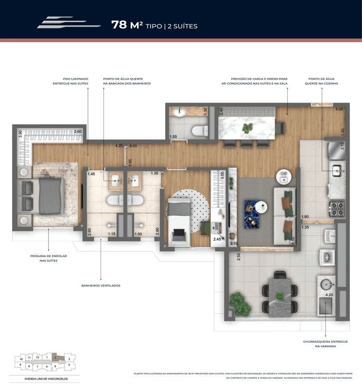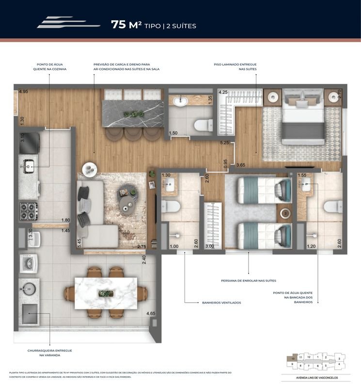 - Plantas Tipo 49 a 90m² Privativos com 1 ou 2 Suítes.