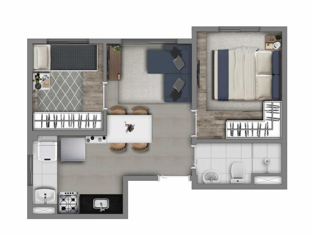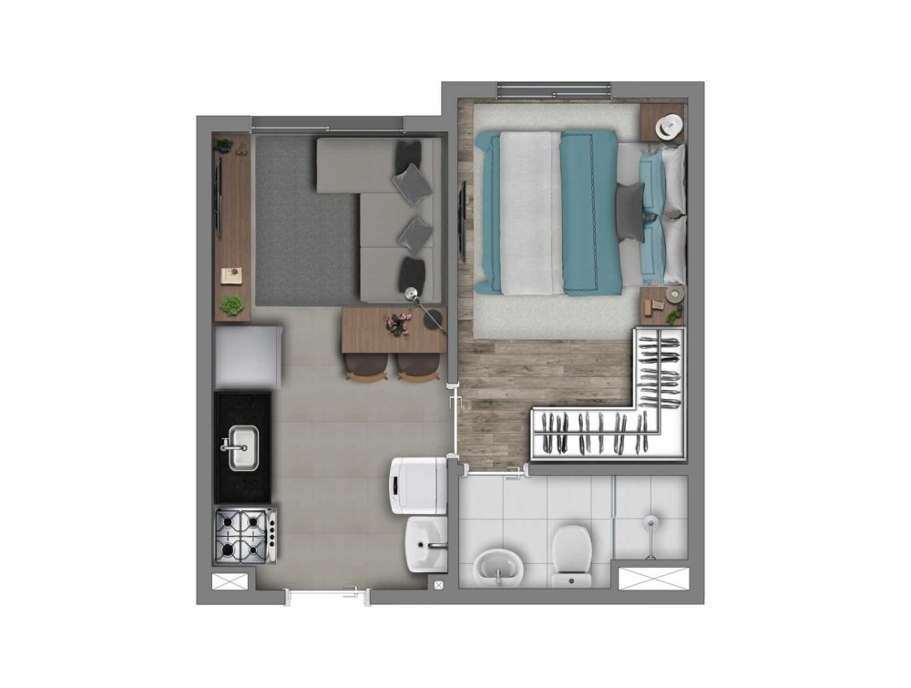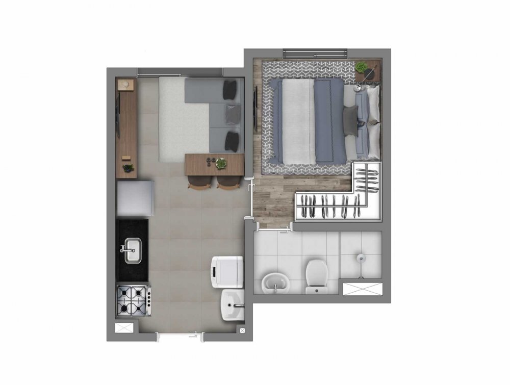 24m²- 01 dormitório com banheiro estilo suíte sem varanda e vaga.