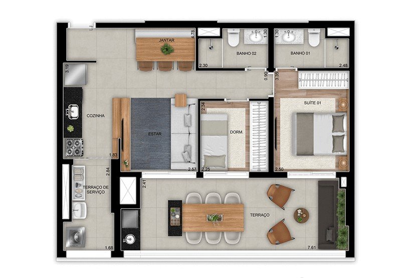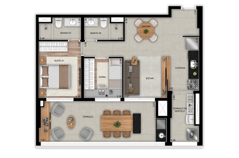 2. Variedade de Opções de Apartamentos: Os apartamentos oferecem opções de 75 a 119m², com 2 e 3 quartos, sendo algumas unidades com 1 suíte e outras com 3 suítes. Além disso, há opções de studios de 25 a 31m².