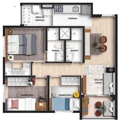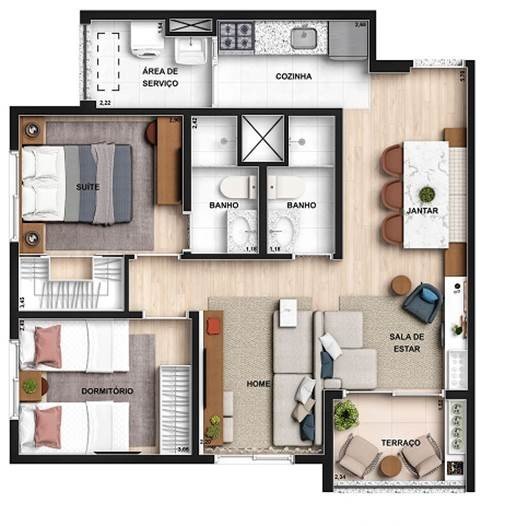 Apartamento em Venda com 2 dormitórios, sendo 1 suíte, 51 m²